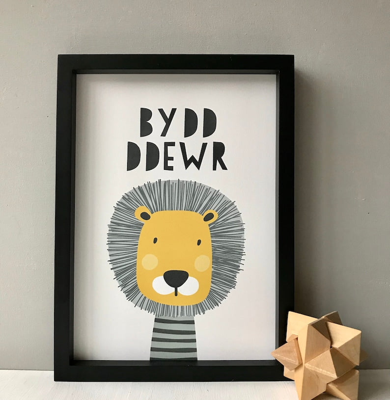'Bydd Ddewr' Lion Print – a bright and cheerful Welsh motivational design featuring the phrase in a fun and lively style.