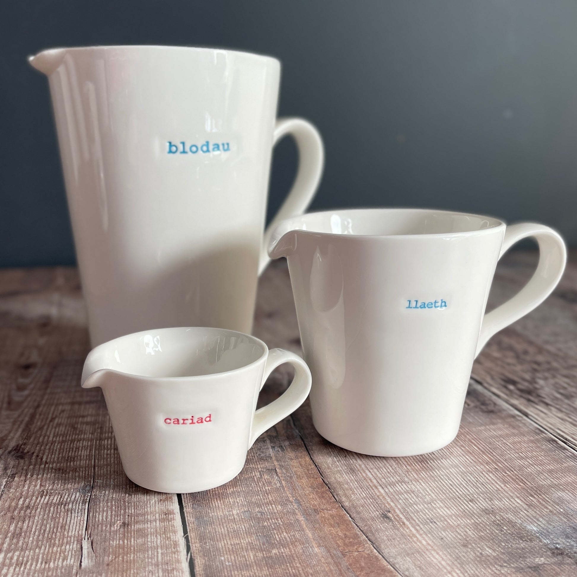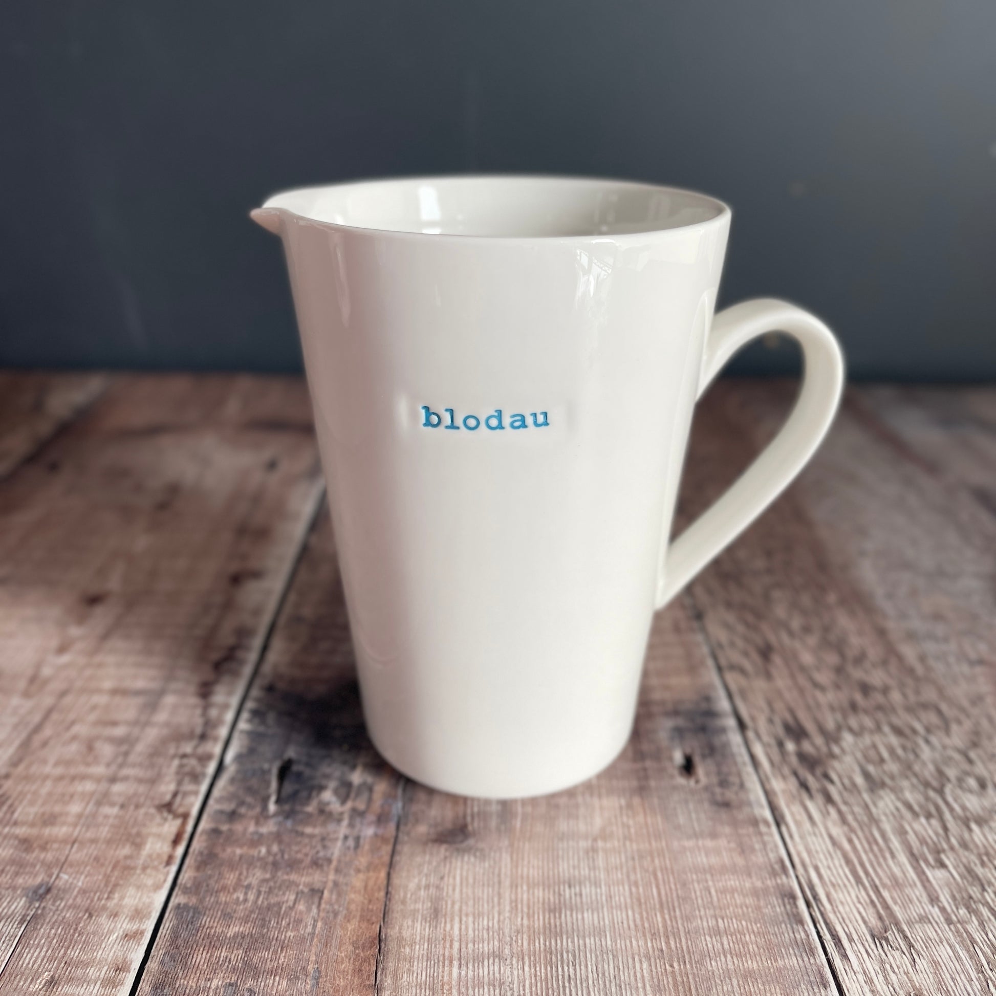 - Hand stamped with ‘blodau’ in blue typewriter font this extra-large ceramic jug by Keith Brymer Jones makes a beautiful alternative to the traditional vase. (1000ml)