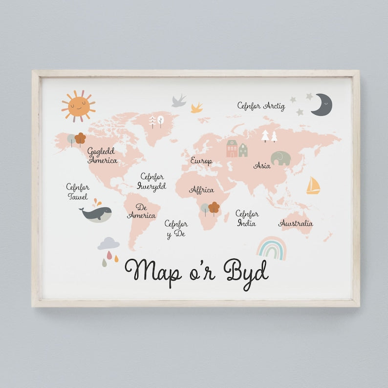 Welsh Map of the World Print featuring adorable icons, perfect for learning and fun!