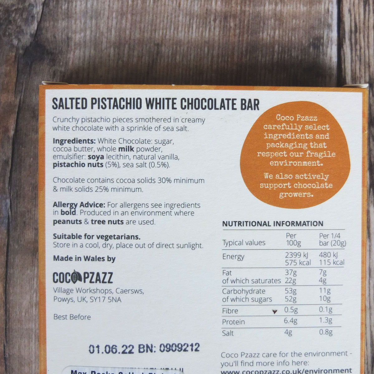 • Crunchy pistachio, creamy white chocolate topped with a sprinkle of sea salt
