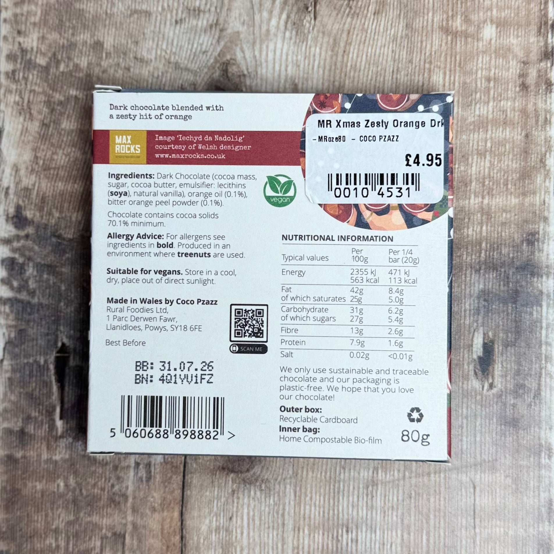Delicious festive dark chocolate bar blended with a zesty hit of orange. Deliciousness so moreish!