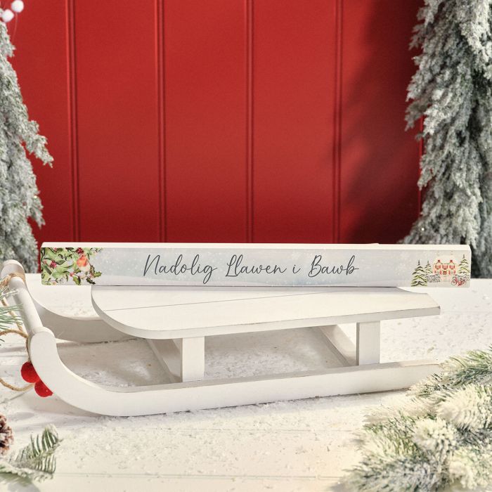 • Primarily white with colorful festive accents on both ends, welsh holiday greeting is displayed across the front.