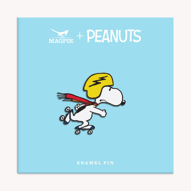 Show off your love for Peanuts with this bold and playful Snoopy Roller Derby Pin! Crafted from black nickel-plated brass and finished with vibrant coloured enamel, this pin captures Snoopy in full action, bringing attitude and charm to any outfit or accessory.