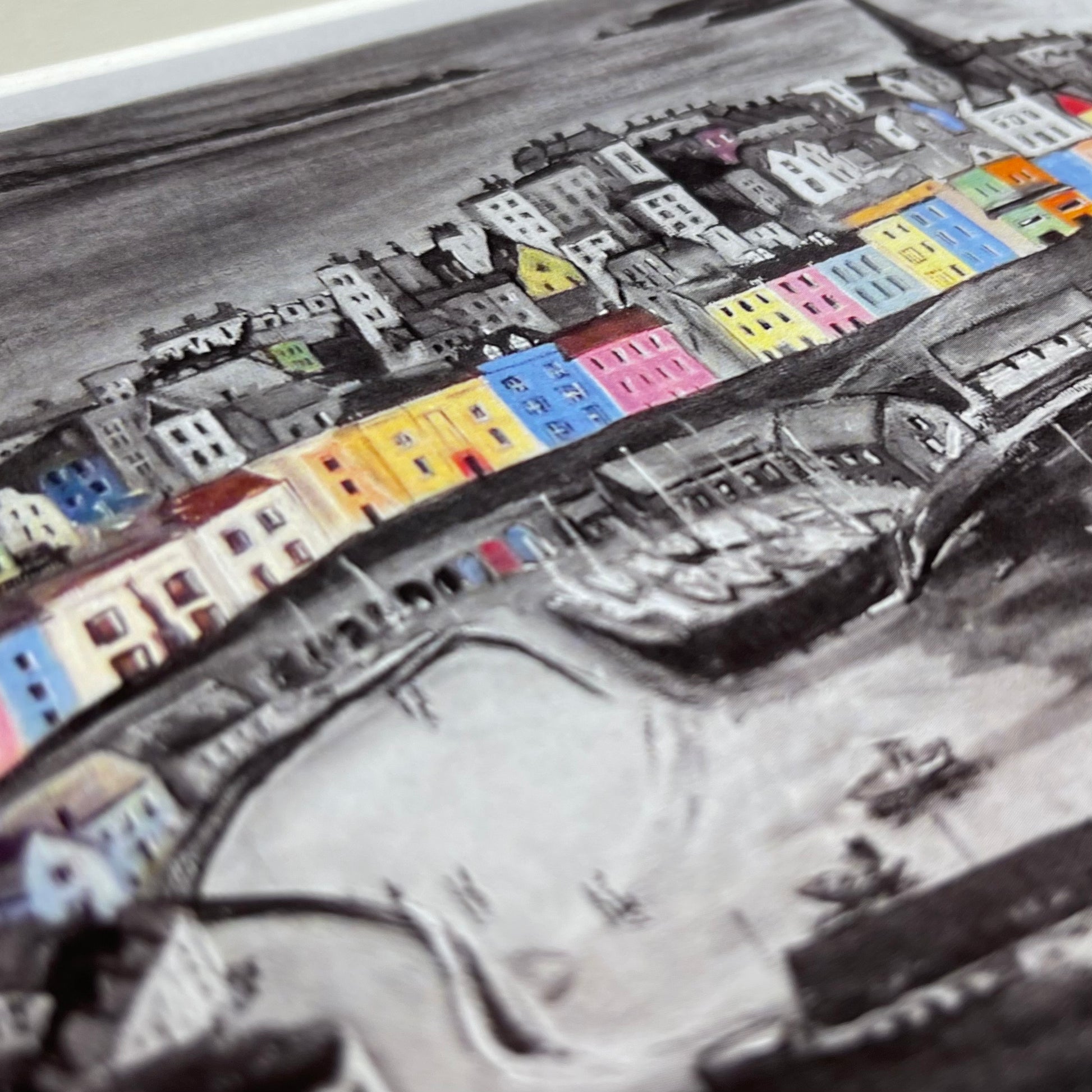 • The greyscale background pushes the vibrancy of the iconic buildings to a whole new level in this stunning print
