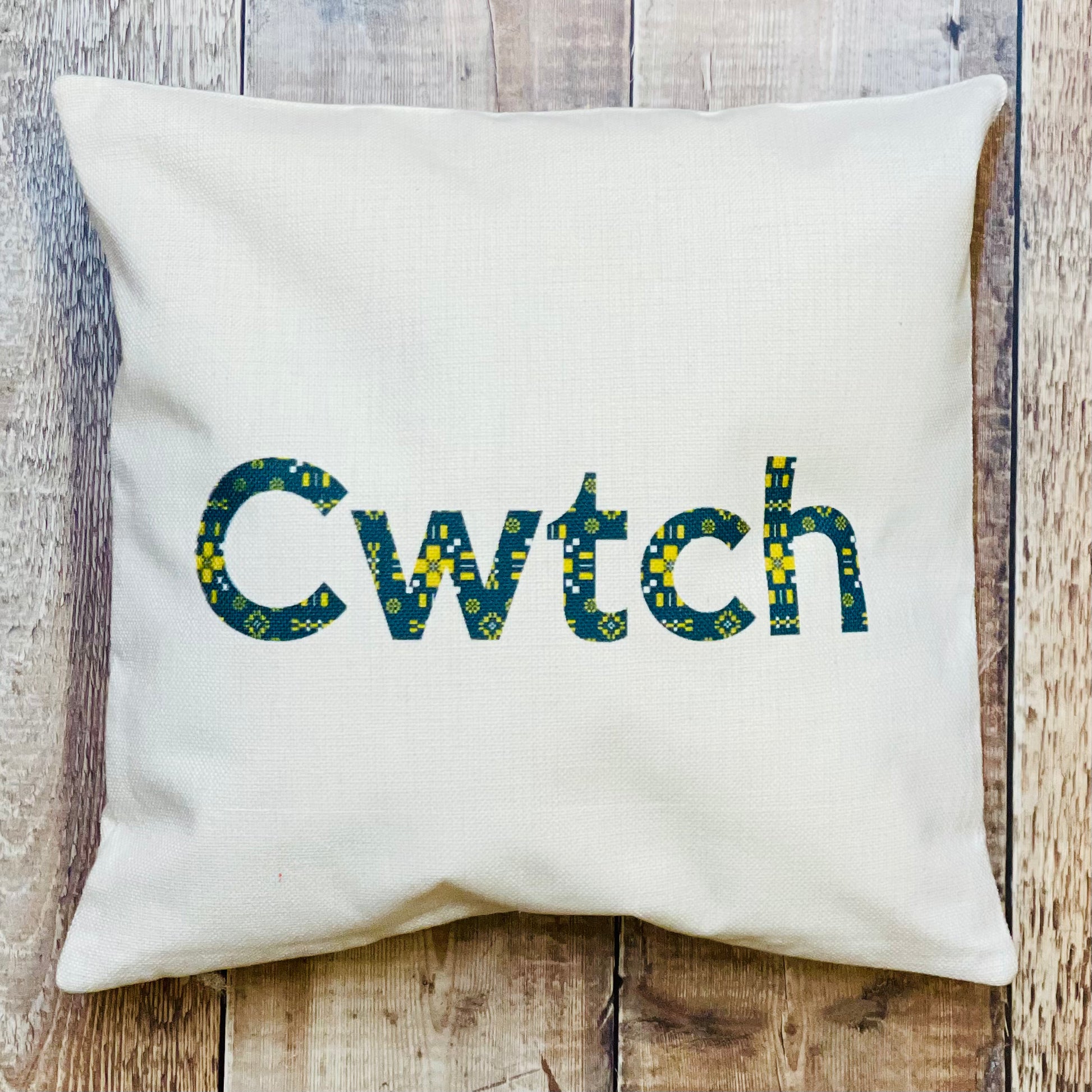 • Linen-effect polyester cushion sublimation printed with the word 'Cwtch', which is Welsh for cuddle or a safe place.