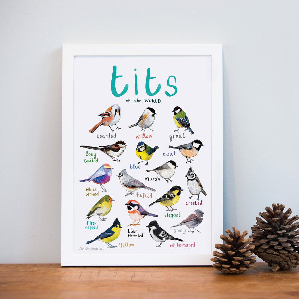 The new 'Tits of the WORLD' print features 16 birds, all beautifully hand drawn, coloured and named. An educational print with a pun-inspired twist!