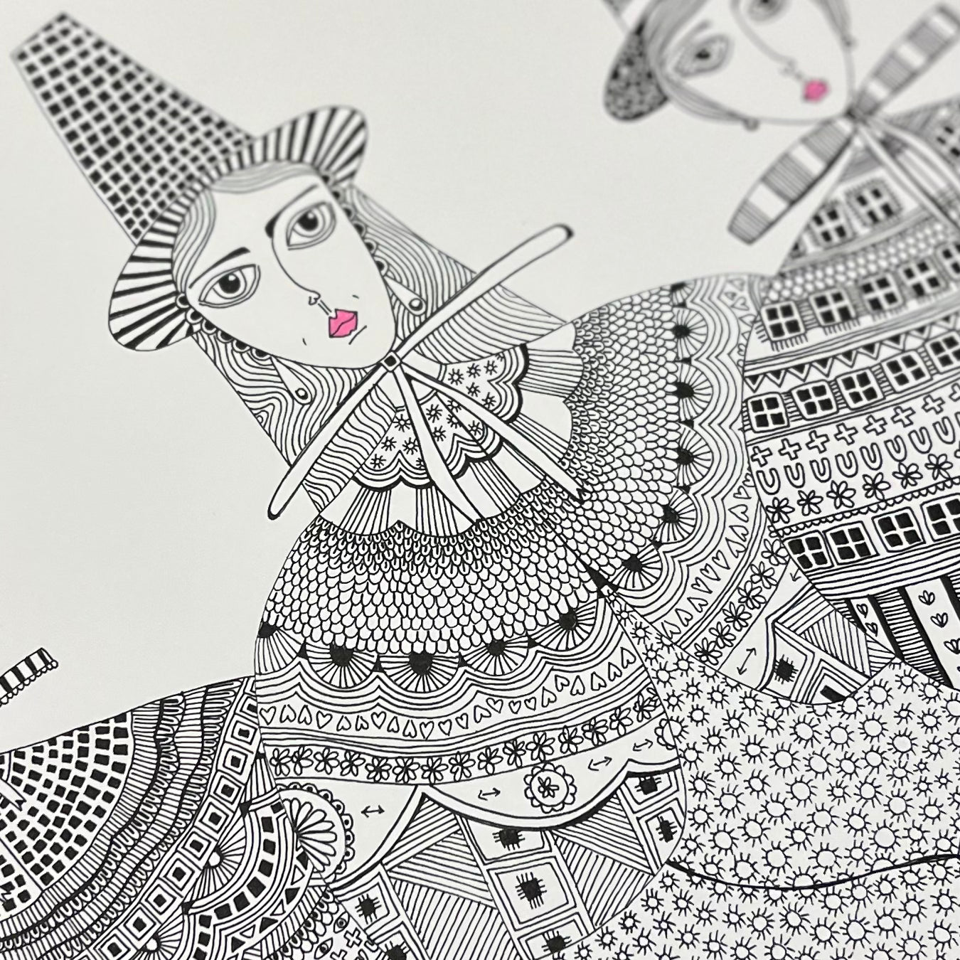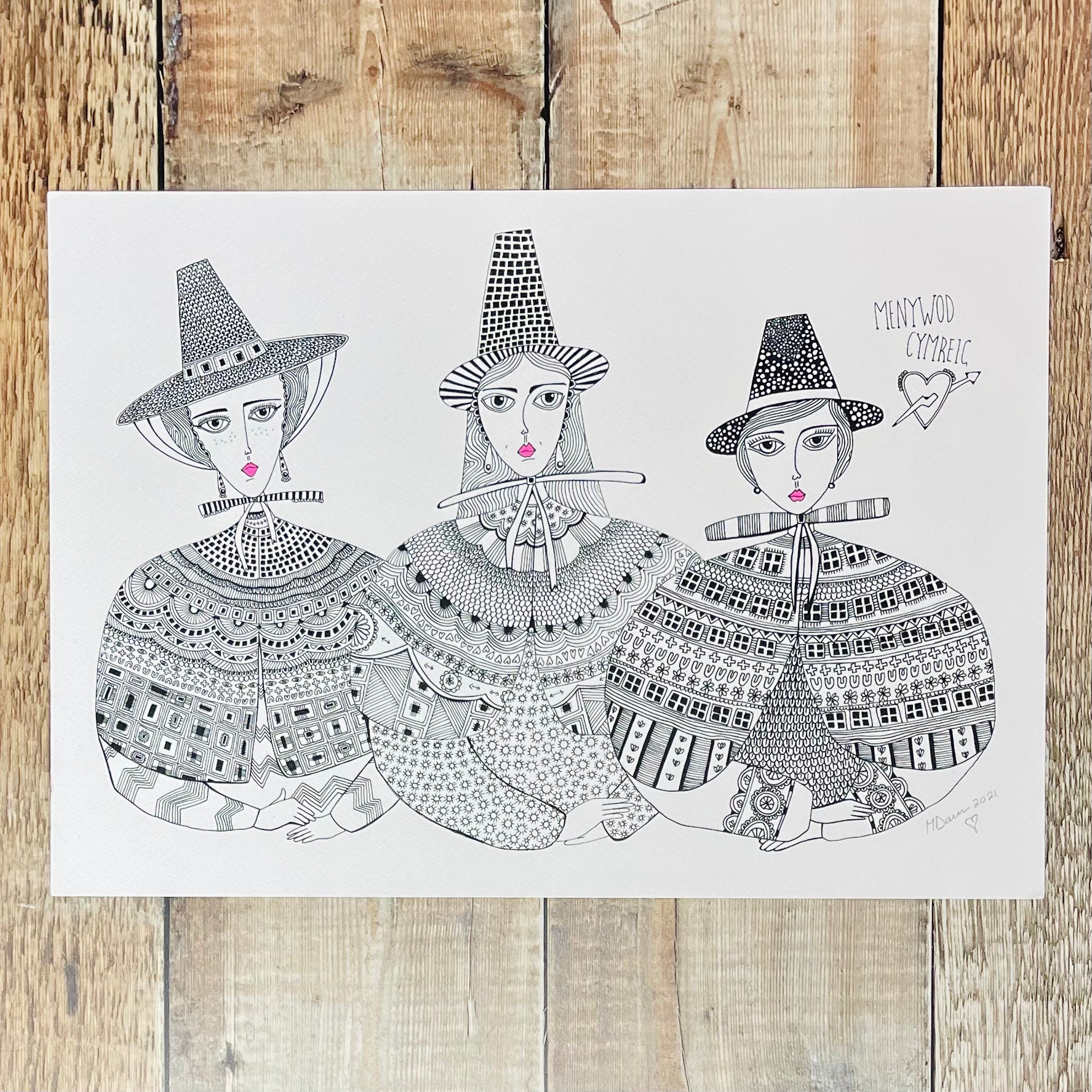 • Traditional Welsh ladies hand drawn in ink by a local illustrator. Each print is hand finished with a signature and coloured lips.