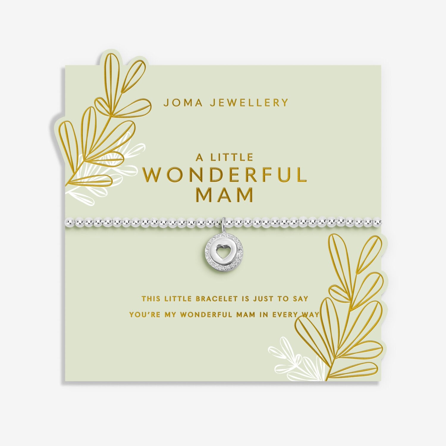 Celebrate the Mam who's there through every cheer, every tear, and every chapter. This collection has been thoughtfully designed, sitting pretty on a gorgeous cut-out floral presentation card this 'Wonderful Mam' Bracelet in Silver Plating is threaded with silver-plated beads and crowned with a heart charm, representing a love that blooms all year round.